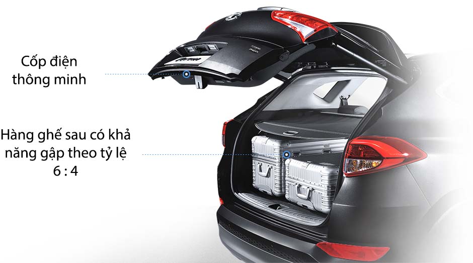 Cốp điện thông minh được đánh giá là tính năng hữu dụng trên chiếc xe đa dụng cỡ vừa Hyundai Tucson. Trong tất cả phiên bản xe thuộc các thương hiệu xe phổ thông ở Việt Nam, duy nhất Tucson được trang bị tùy chọn này.