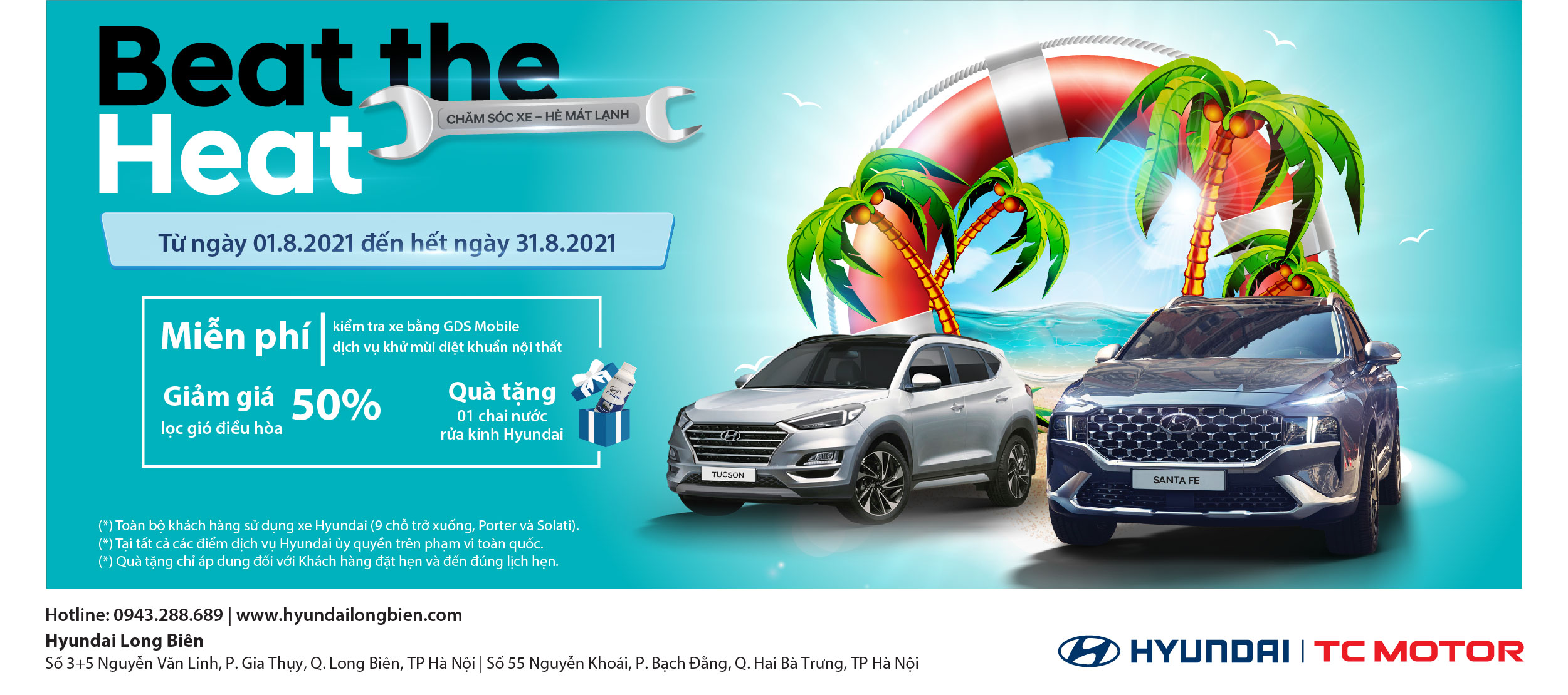 Từ ngày 01.8.2021 đến hết ngày 31.8.2021, Hyundai Long Biên - Đại lý ủy quyền của TC MOTOR gửi tới Quý khách hàng chương trình khuyến mại "Beat the Heat - Chăm sóc xe - Hè mát lạnh"