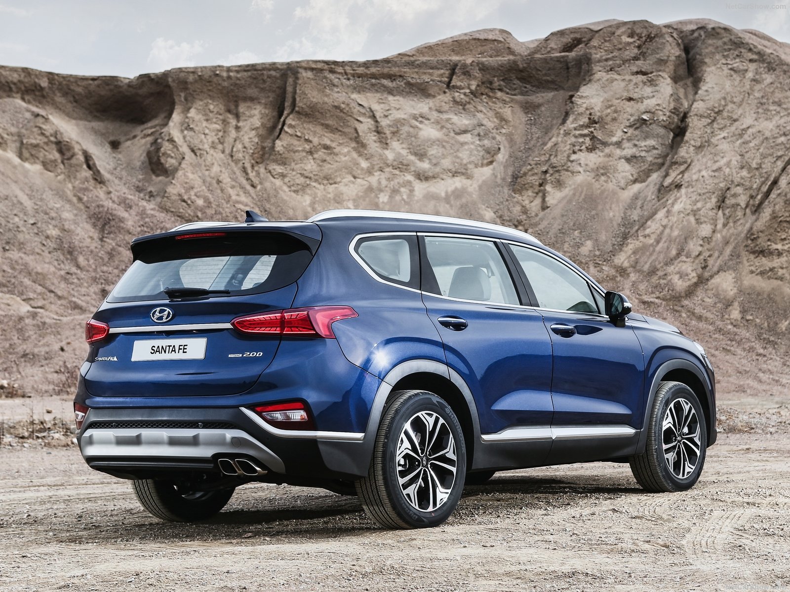 Hyundai Santa Fe 2019 được trang bị mâm xe bằng hợp kim kích thước 19 inch. Chạy dọc thân nổi bật lên các gân được dập nổi sắc nét, giúp chiếc SUV Santa Fe thêm phần cơ bắp, thể thao hơn. Phía đuôi xe, cụm đèn hậu LED cũng thay đổi hoàn toàn, hẹp hơn và tinh xảo hơn trước.
