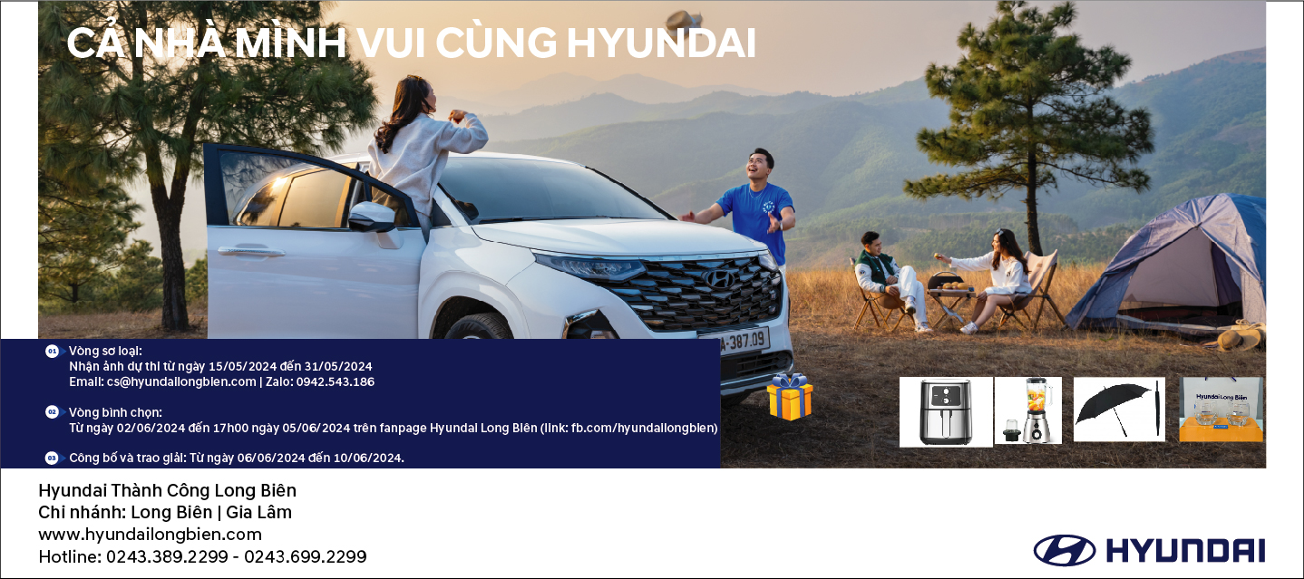 - Nhân dịp ngày Gia đình Việt Nam, Đại lý Hyundai Long Biên tổ chức cuộc thi chụp ảnh cho khách hàng cùng gia đình. Ảnh tham dự chương trình được gửi về BTC thông qua các kênh thông tin sau: Fanpage của Đại lý Hyundai Long Biên; Địa chị email: cs@hyundailongbien.com hoặc zalo số ĐT: 0942.543.186