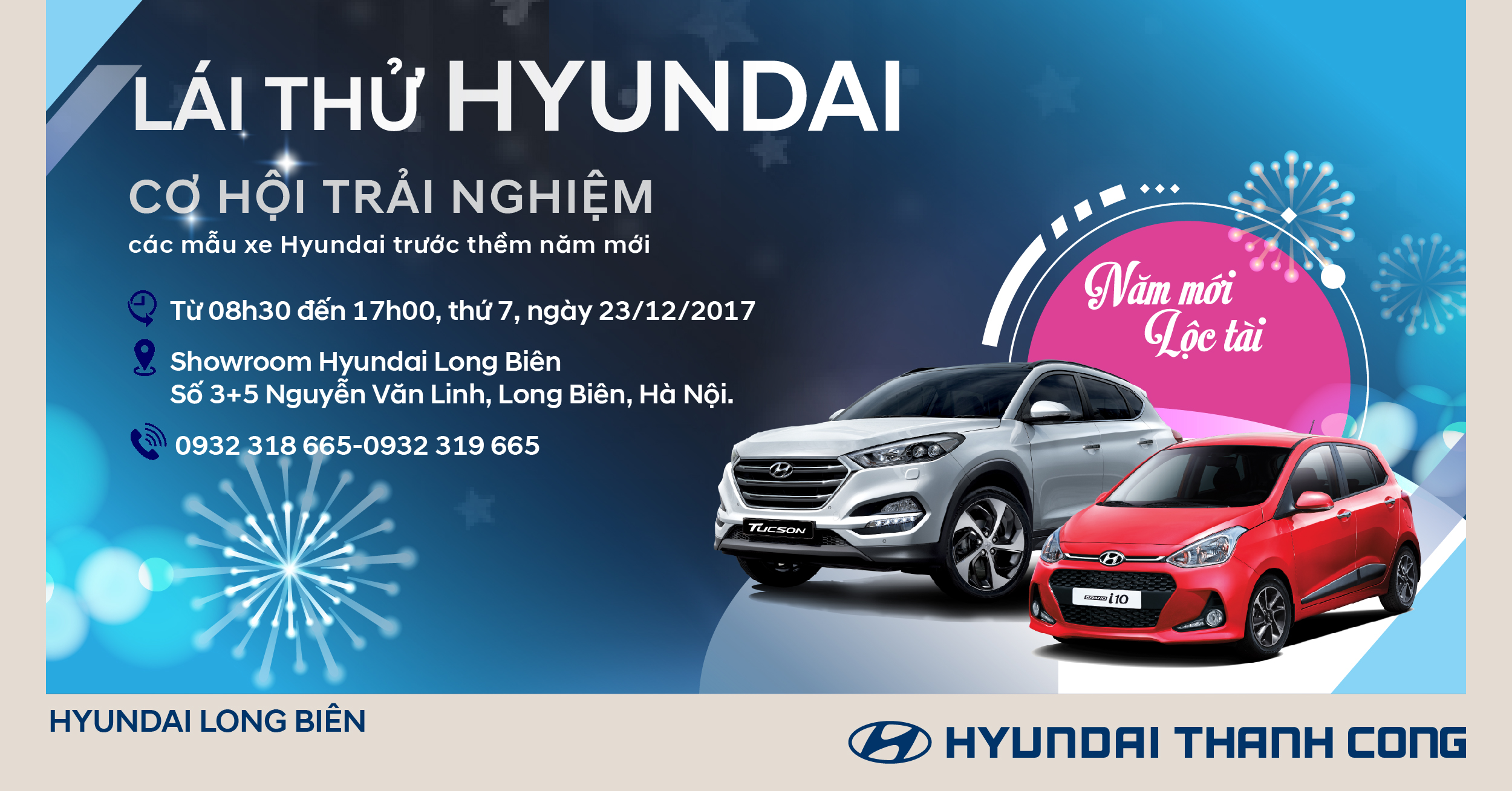 LÁI THỬ HYUNDAI - NĂM MỚI ĐÓN LỘC TÀI” vào thứ 7, ngày 23/12/2017. Đến với chương trình, Quý khách hàng sẽ có cơ hội được cảm nhận trực tiếp thực tế lái các mẫu xe của Hyundai như Tucson 2017, i10 2017, SantaFe, Elantra,..., bên cạnh đó Quý khách hàng sẽ nhận nhiều những phần quà có giá trị.