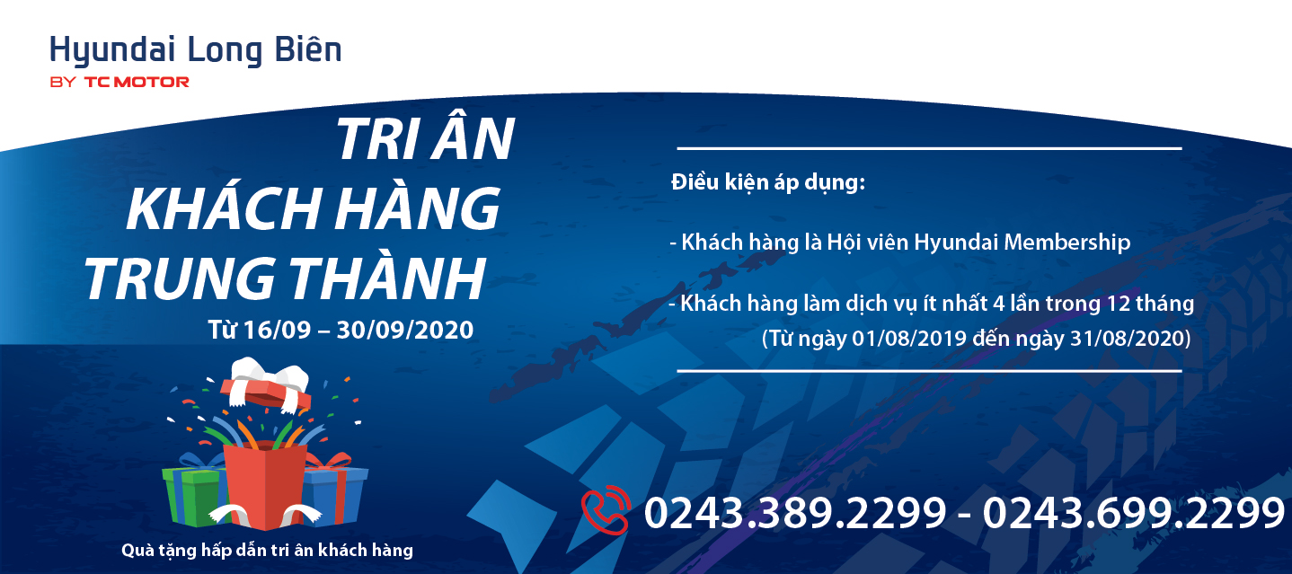 Nhằm tri ân Quý khách hàng đã và đang tin tưởng, sử dụng sản phẩm, dịch vụ chính hãng Hyundai, Hyundai Long Biên xin gửi tới Quý khách hàng chương trình tri ân "TRI ÂN KHÁCH HÀNG TRUNG THÀNH" với nhiều quà tặng hấp dẫn.