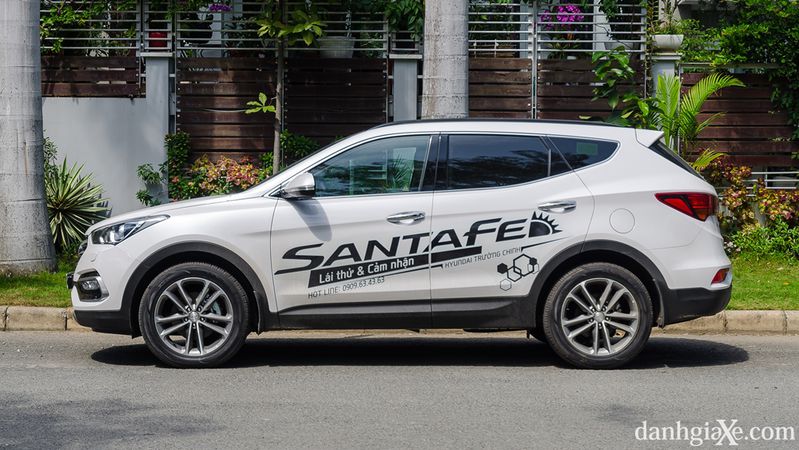 Quan sát từ bên cạnh, SantaFe vẫn giữ nguyên dáng dấp năng động và khỏe khoắn vốn đã ghi điểm từ thế hệ trước. Các đường nét được Hyundai điều tiết khéo léo và trau chuốt, từ tạo hình dài và hẹp của khung cửa kính, gân dập nổi xẻ dọc thân xe và cắt qua tay nắm mạ chrome đến vạt đèn hậu phía sau cho đến “đường viền nổi” tinh tế ở các hốc bánh xe và bên dưới cửa ra vào.