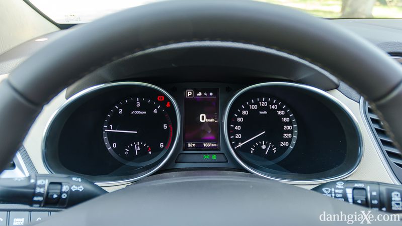 Cụm hiển thị vòng tua và vận tốc của SantaFe đối xứng nhau qua một màn hình đa thông tin, cả ba phối hợp cùng các biểu tượng cảnh báo giúp người lái luôn nắm được tình trạng hoạt động của xe một cách trực quan, sinh động nhất. Bên cạnh đó, Hyundai cũng mang đến nút tùy chỉnh độ sáng/tối của cụm chi tiết này, tính năng mà một vài chiếc SUV có giá bán cao hơn đã “vô tình” bỏ quên.