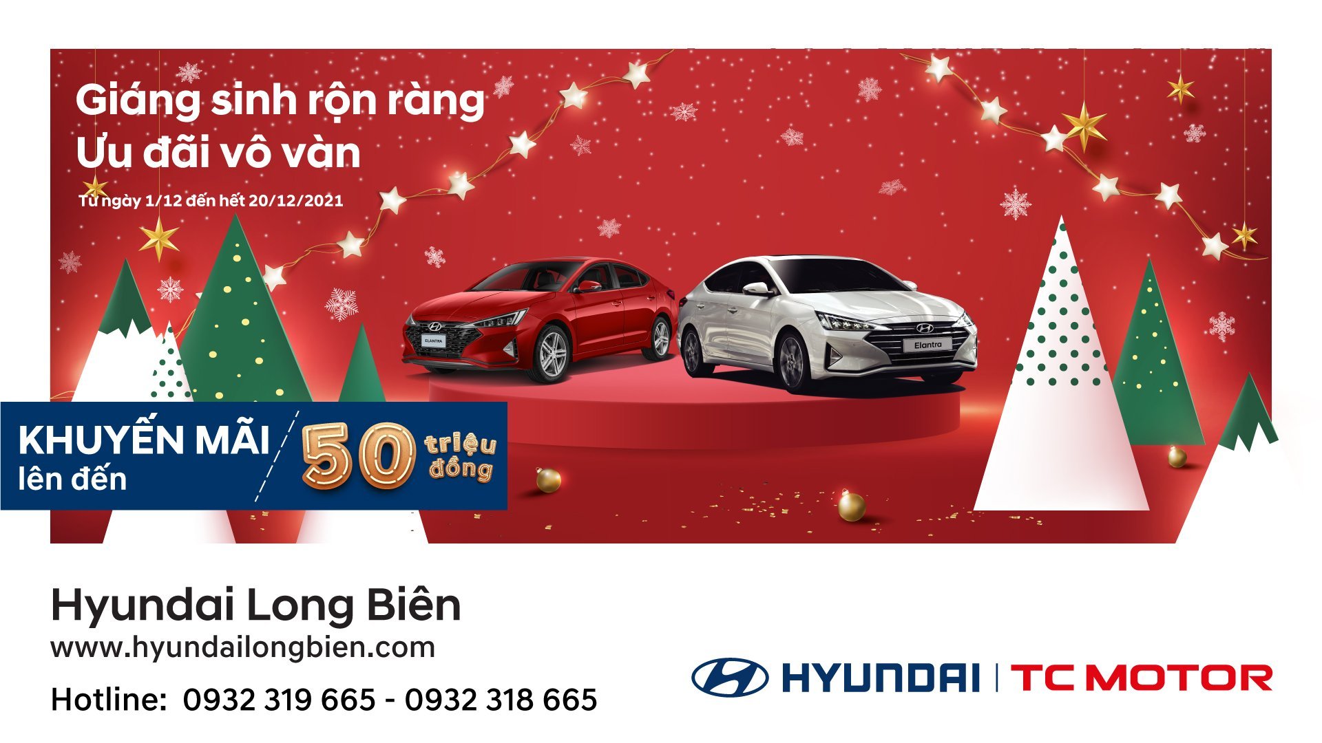 Từ nay cho đến hết 20/12/2021, Hyundai Long Biên triển khai chương trình ưu đãi tháng 12 “GIÁNG SINH RỘNG RÀNG - ƯU ĐÃI VÔ VÀN - Giảm giá lên tới 50 triệu khi mua xe Elantra” tại Showrom Hyundai Long Biên, địa chỉ: sô 3+5, Nguyễn Văn Linh, Long Biên, Hà Nội.