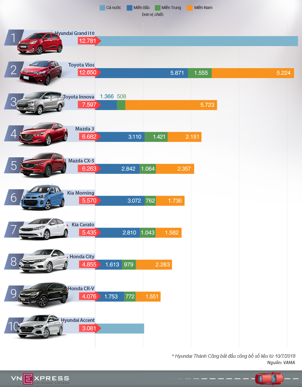 - Grand i10 với gần 13.000 xe được bán ra, đứng ở vị trí dẫn đầu