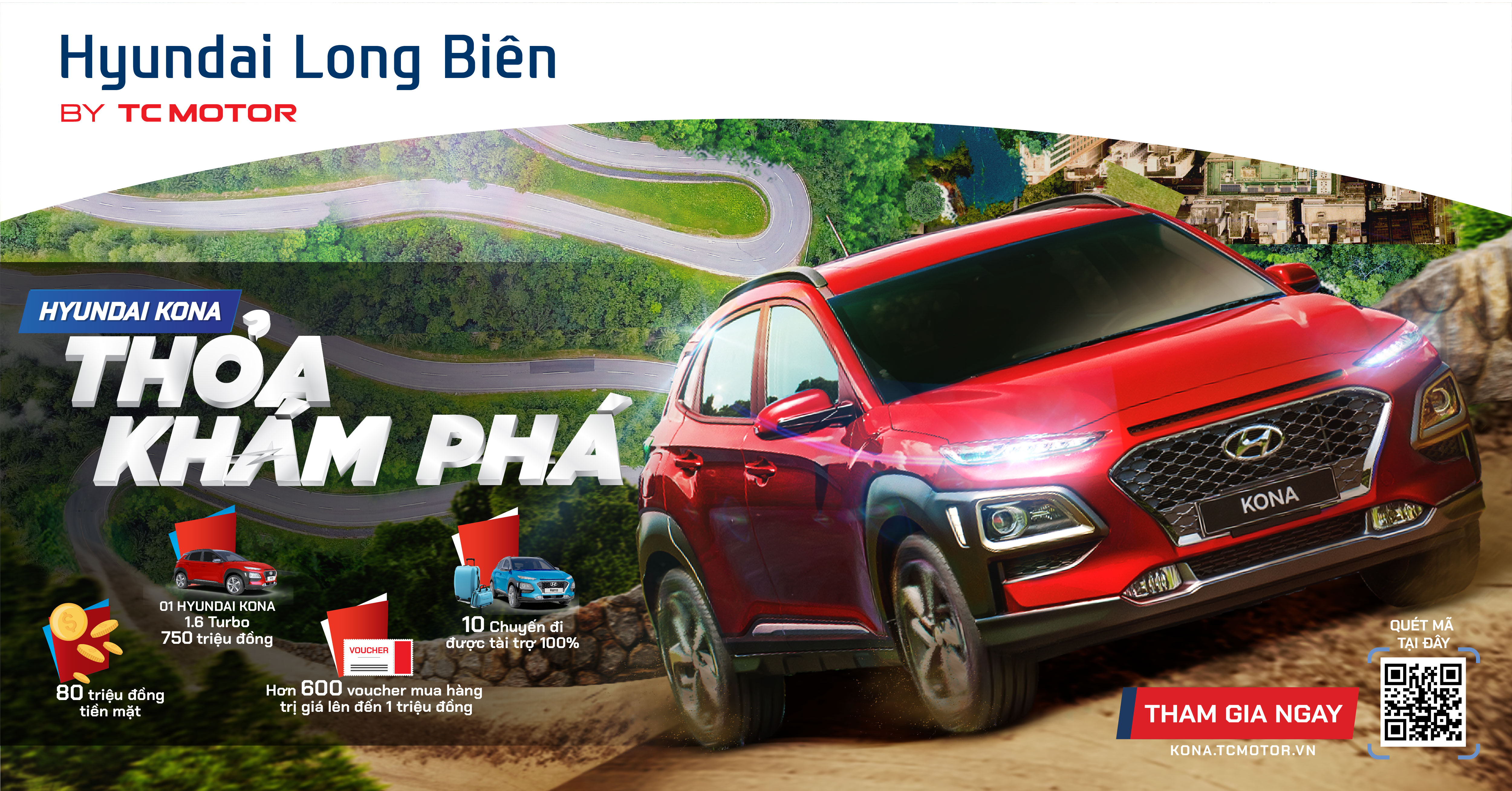 TC MOTOR chính thức triển khai chương trình: “Kona – Thoả khám phá” với giải thưởng lớn nhất là 01 chiếc xe Hyundai Kona 1.6 Turbo trị giá 750 triệu đồng, 10 chuyến du lịch miễn phí để khám phá 10 cung đường đẹp nhất Việt Nam cùng các ekip hot travel blogger và hàng trăm phần thưởng có giá trị khác