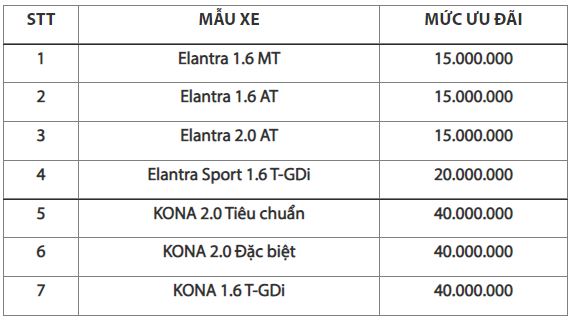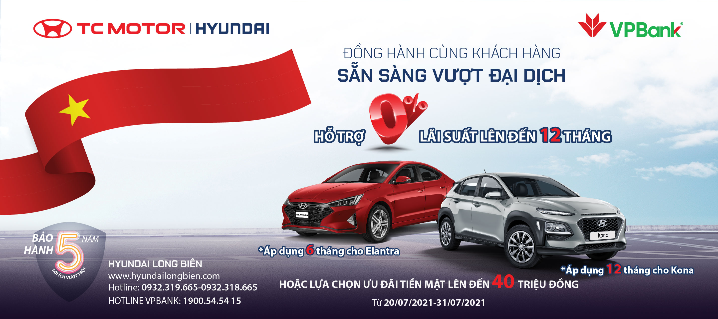 Nhằm hỗ trợ người tiêu dùng có được chiếc xe phù hợp với ngân sách cá nhân, đặc biệt trong giai đoạn dịch Covid-19 đang có nhiều diễn biến phức tạp, từ ngày 20/07/2021 cho đến hết ngày 31/07/2021, Hyundai Long Biên thực hiện chương trình khuyến mại đặc biệt cho các khách hàng chọn mua sản phẩm Hyundai KONA và Elantra. Khách hàng mua xe Kona và Elantra sẽ được lựa chọn 1 trong 2 hình thức: ưu đãi lên tới 40 triệu hoặc trả góp lãi suất 0%.