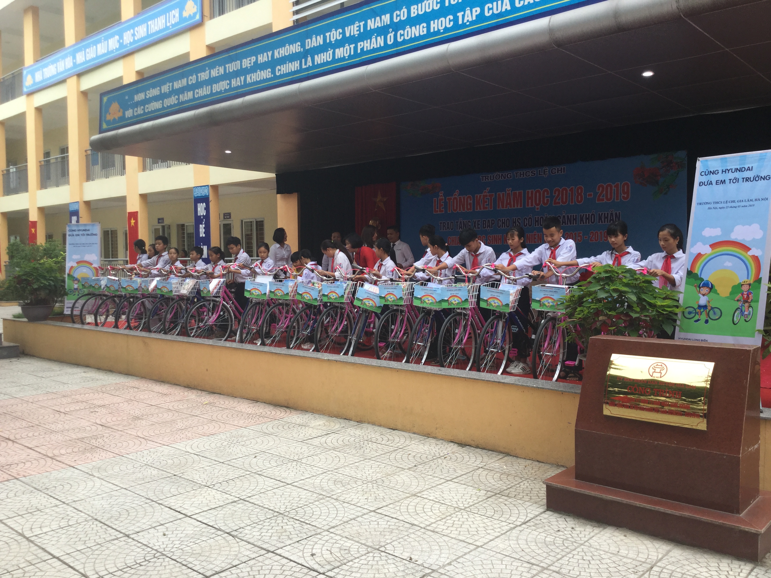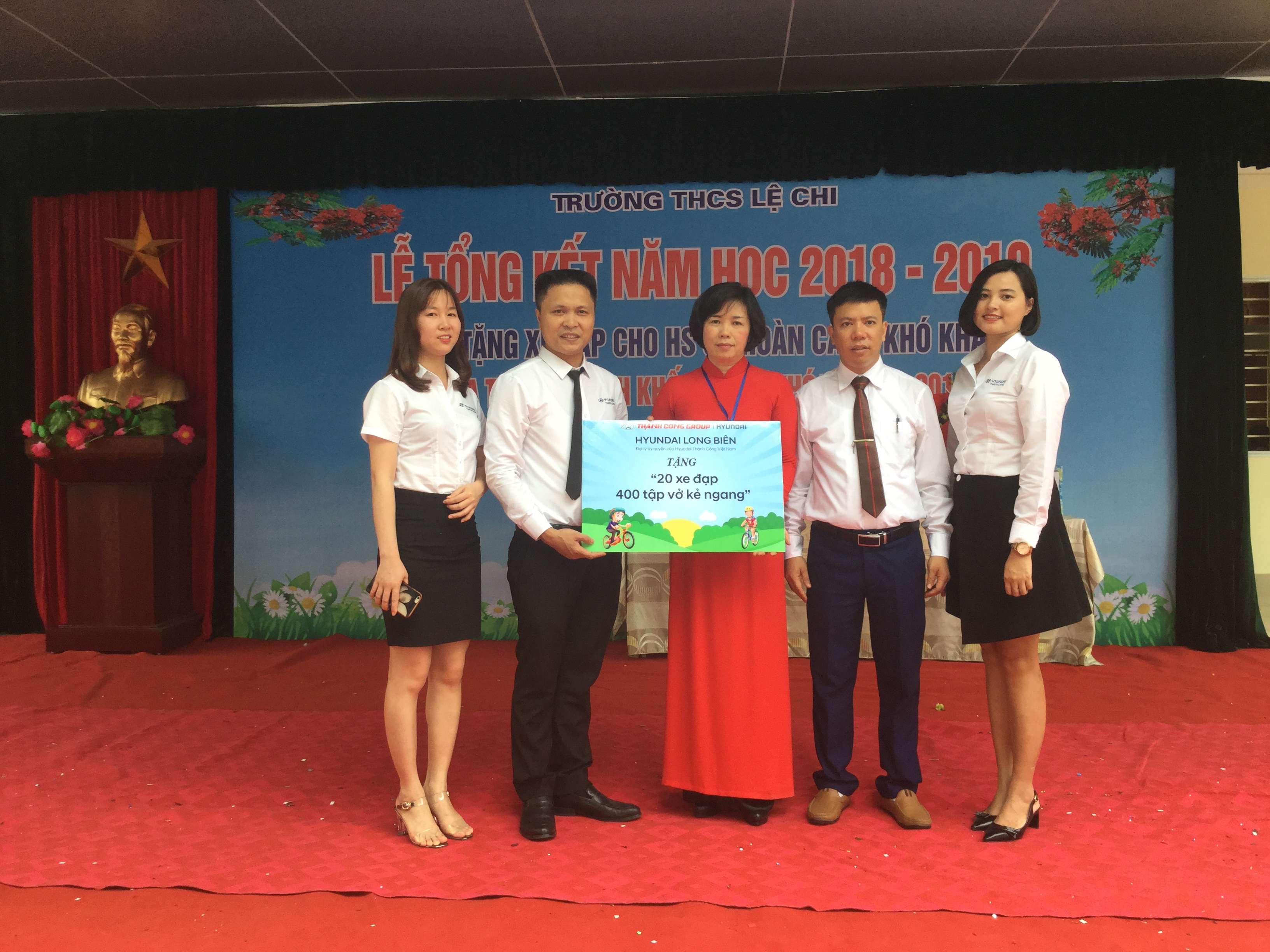 Với ý nghĩa kết nối yêu thương, sẻ chia cùng những hoàn cảnh khó khăn trong cuộc sống, sáng ngày 23/5/2019, tại lễ Bế giảng trường THCS Lệ Chi, Hyundai Long Biên là đại lý ủy quyền của Hyundai Thành Công Việt Nam tổ chức chương trình thiện nguyện với chủ đề: "Cùng Hyundai đưa em tới trường" mang đến cho các em học sinh thuộc diện hộ nghèo hiếu học tại trường THCS Lệ Chi, Gia Lâm, Hà Nội 20 suất nhận xe đạp và 400 tập vở kẻ ngang để hỗ trợ việc đến trường, khích lệ động viên tinh thần các em.