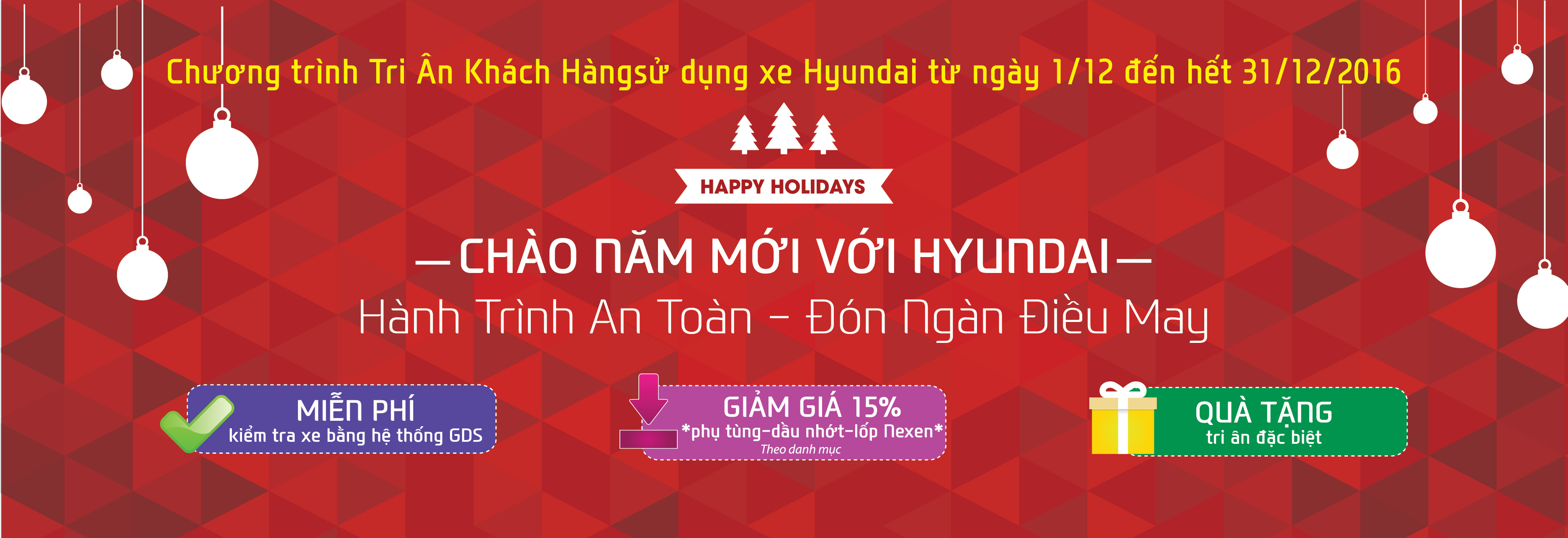 Nhằm đáp ứng nhu cầu sửa chữa bảo dưỡng xe dịp cuối năm, Hyundai Thành Công thực hiện chương trình Khuyến mại Dịch vụ cuối năm 2016. Đây là món quà tri ân mà Hyundai Thành Công gửi tới khách hàng đã luôn tin tưởng và ủng hộ thương hiệu xe Hyundai tại Việt Nam.