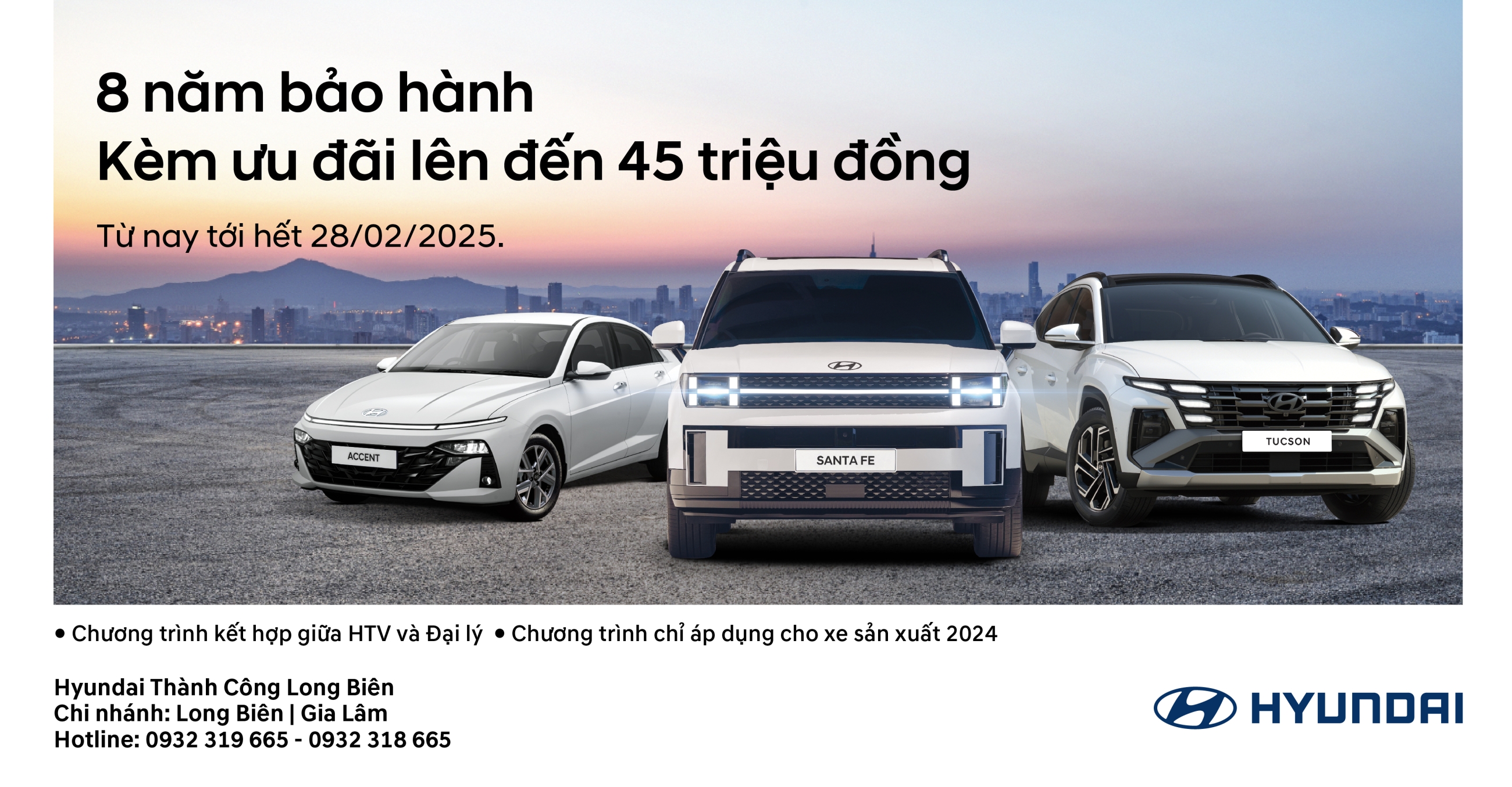 Chào đón năm mới Ất Tỵ 2025, với mong muốn mang đến nhiều hơn nữa cơ hội sở hữu và sử dụng các mẫu xe ô tô Hyundai, giúp khách hàng có được những giây phút thưởng ngoạn những cung đường và danh lam thắng cảnh cùng người thân, HTV chính thức triển khai chương trình ưu đãi kép: Nâng thời gian bảo hành lên 8 năm hoặc 120.000km tùy điều kiện nào đến trước, đồng thời ưu đãi trực tiếp vào giá bán lên đến 45 triệu đồng. Cả hai ưu đãi này được áp dụng đồng thời cho các hợp đồng mua bán được giao dịch thành công trong tháng 2/2025 với các mẫu xe sản xuất năm 2024 (VIN 2024).