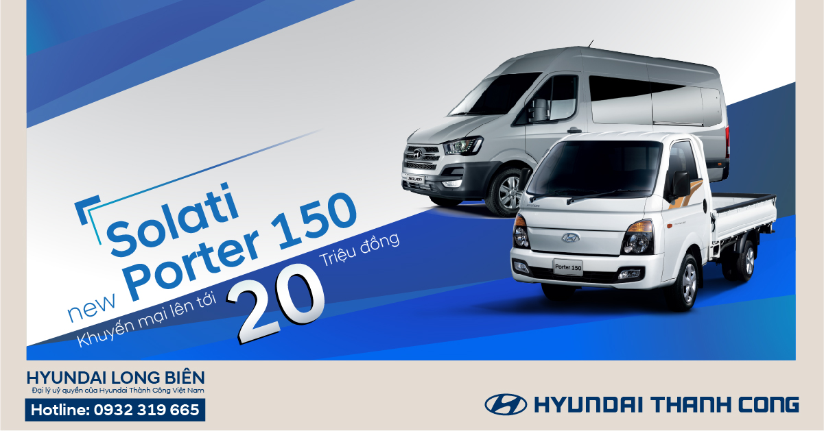 Nhằm hỗ trợ người tiêu dùng, đặc biệt là các đơn vị vận tải có được chiếc xe phù hợp với hoạt động sản xuất kinh doanh, từ ngày 01/08/2018 cho đến hết ngày 31/08/2018, Hyundai Long Biên - Đại lý ủy quyền Hyundai Thành Công Việt Nam thực hiện chương trình khuyến mại đặc biệt cho các khách hàng chọn mua sản phẩm New Porter 150 và Solati với mức ưu đãi 20 triệu đồng.