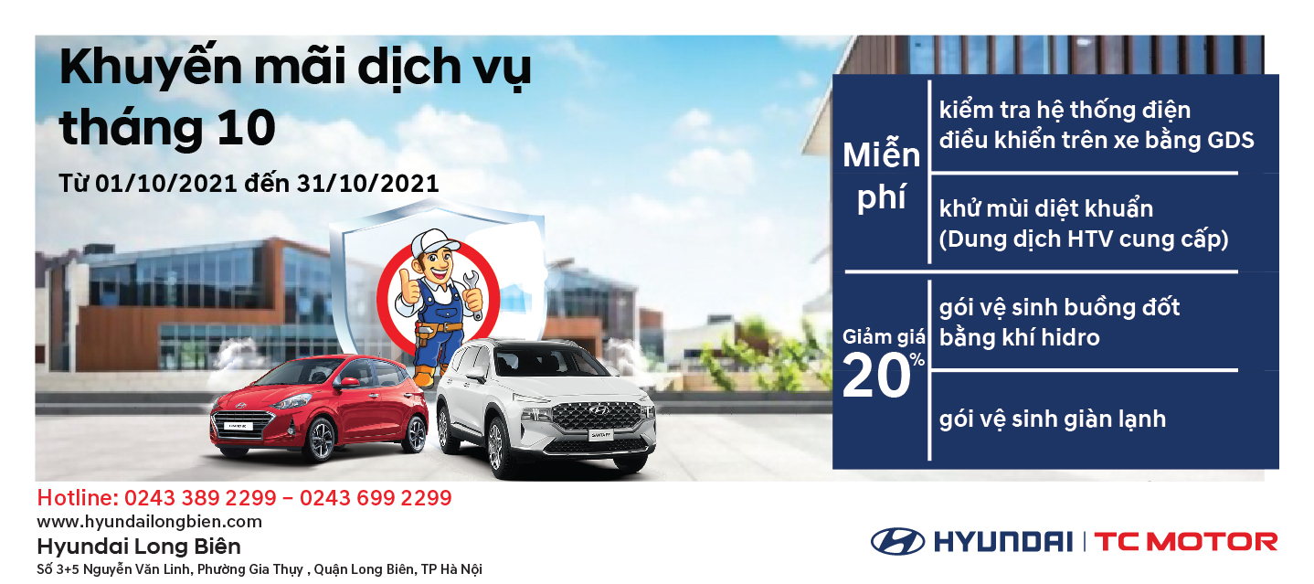 Nhằm tri ân Quý khách hàng đã và đang tin tưởng, sử dụng các sản phẩm, dịch vụ chính hãng của Hyundai. Hyundai Long Biên xin gửi tới Quý khách hàng chương trình “Khuyến mãi dịch vụ tháng 10”