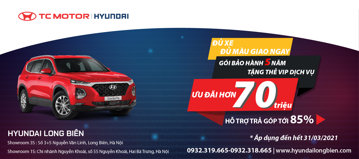 Nhằm hỗ trợ người tiêu dùng có được chiếc xe phù hợp với ngân sách cá nhân, từ nay cho đến hết ngày 31/03/2021, Hyundai Long Biên by TC MOTOR thực hiện chương trình khuyến mại đặc biệt cho các khách hàng chọn mua sản phẩm Hyundai SantaFe với mức ưu đãi lên tới 70 triệu đồng, cùng gói bảo hành VIP dịch vụ 5 năm, hỗ trợ trả góp lên tới 85%.