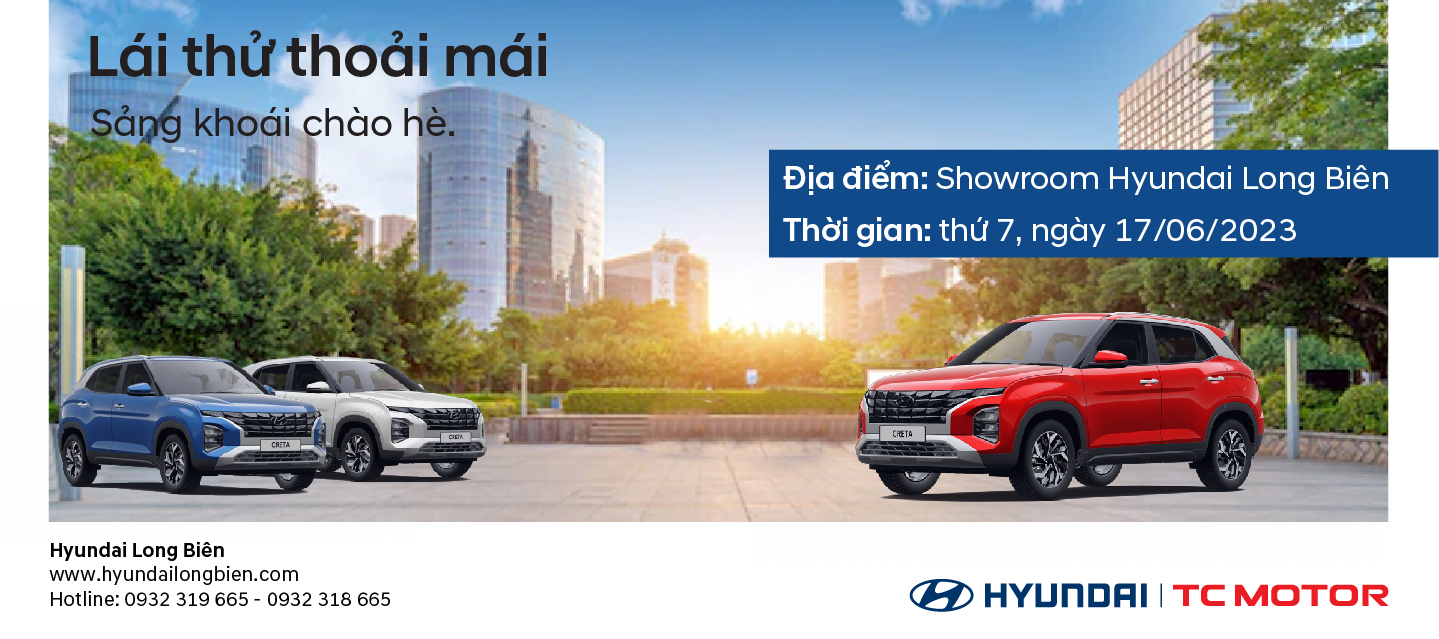 Chào đón hè 2023 sôi động, Hyundai Long Biên chương trình "Lái thử thoái - Sảng khoái chào hè". Hãy cùng đến trải nghiệm và cảm nhận cầm lái xe Hyundai Creta vào thứ 7, ngày 17/06/2023.