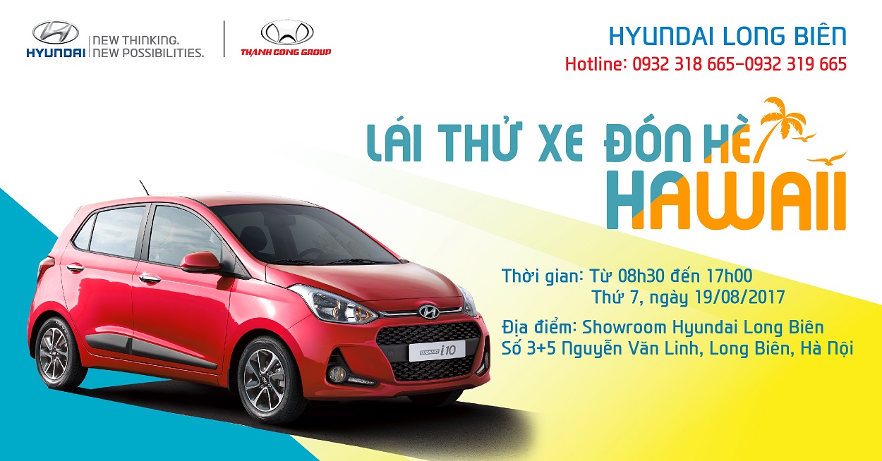 LÁI THỬ XE ĐÓN HÈ HAWAII”. Đến với chương trình vào thứ 7 tuần này, ngày 19/08/2017, Quý khách hàng sẽ có cơ hội được cảm nhận trực tiếp thực tế lái các dòng xe của Hyundai. Bên cạnh đó Quý khách hàng còn có cơ hội bốc thăm trúng thưởng chuyến du lịch hè tại Hawaii, cùng nhận những phần quà có giá trị khác.