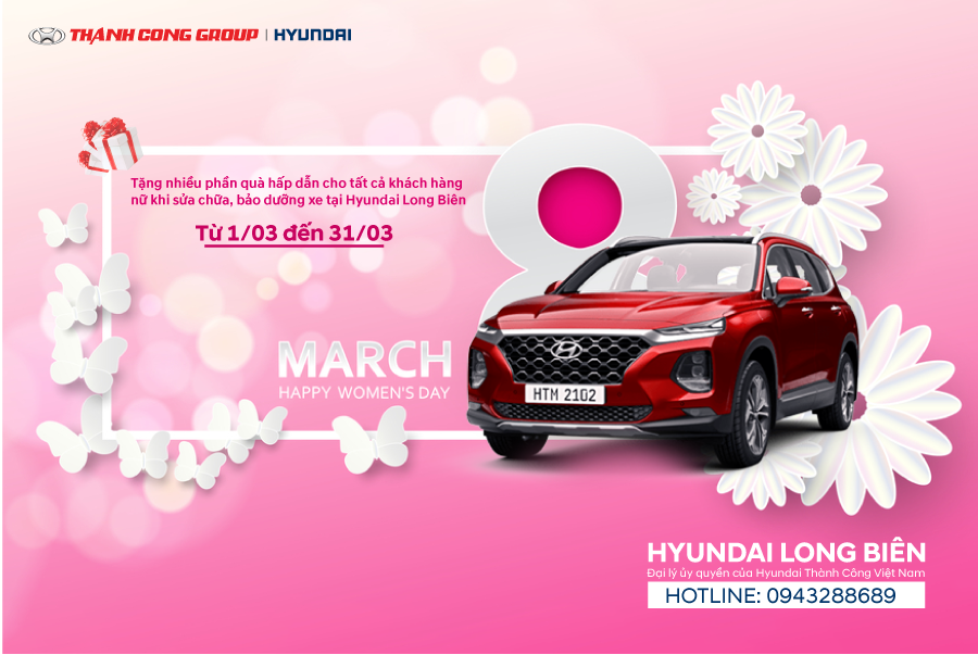 Ngày quốc tế phụ nữ - ngày chúng ta tôn vinh phái đẹp, dành cho họ những điều tuyệt với nhất. Hyundai Long Biên xin gửi tặng nhiều phần quà hấp dẫn đến các khách hàng nữ khi bảo dưỡng xe tại Hyundai Long Biên.