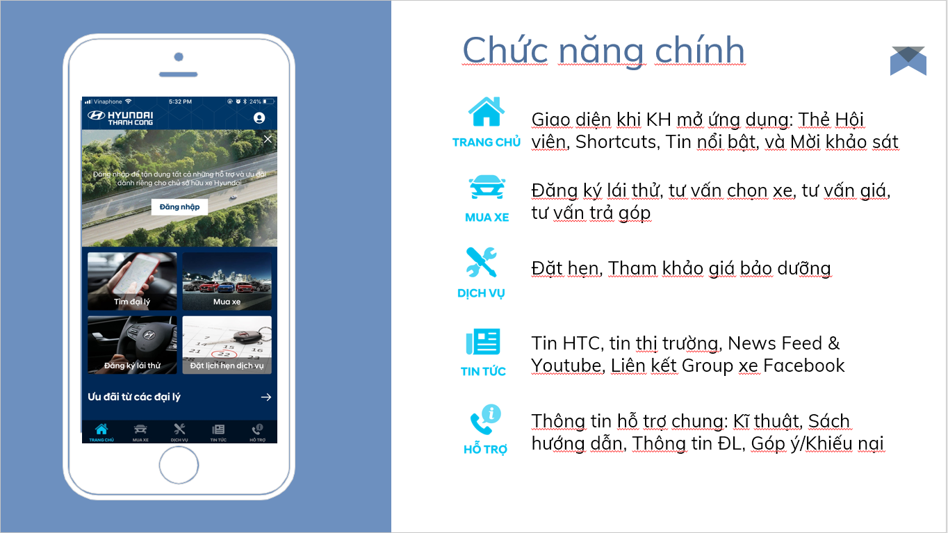 Trên cơ sở nền tảng Lấy Khách Hàng làm Trung tâm với tên gọi ứng dụng mang ý nghĩa về toàn bộ những điều Khách hàng mong muốn và có nhu cầu, Hyundai Thành Công cùng Đại lý phối hợp phát triển một ứng dụng với tiện ích thiết thực vừa đơn giản thân thiện cho Khách hàng với mục tiêu hỗ trợ tối đa trong mỗi hành trình trải nghiệm.