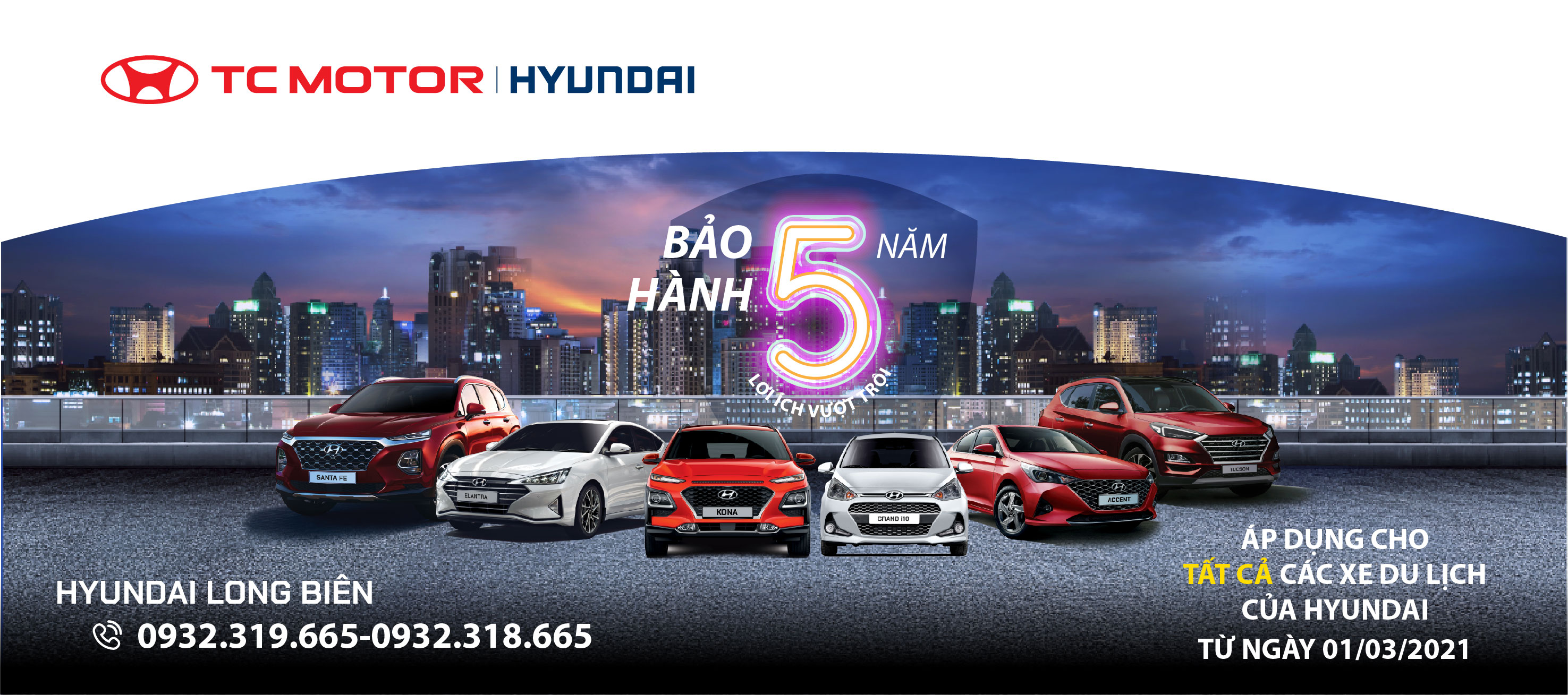 Ngày 01/03/2021, TC MOTOR chính thức thông báo tăng thời gian bảo hành cho tất cả các mẫu xe du lịch Hyundai từ 3 năm thành 5 năm. Thời gian áp dụng từ 01/03/2021.