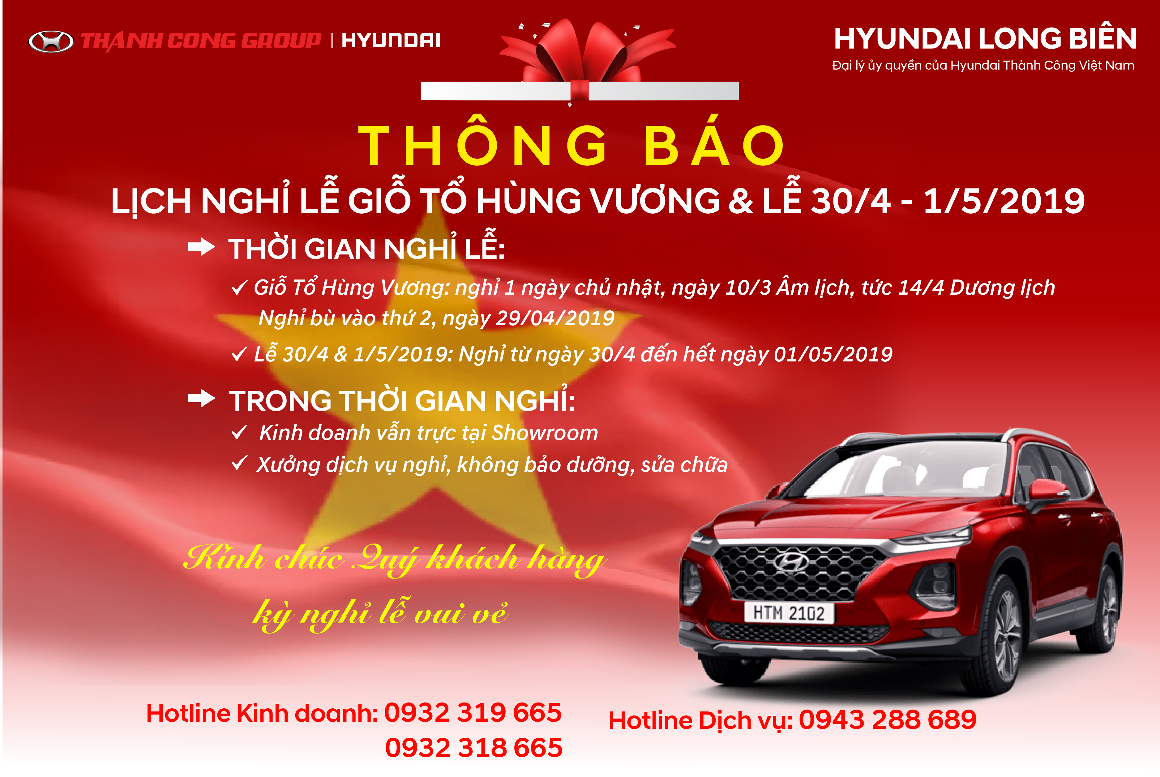 Thông báo LỊCH NGHỈ LỄ GIỖ TỔ HÙNG VƯƠNG & LỄ 30/4 - 1/5/2019