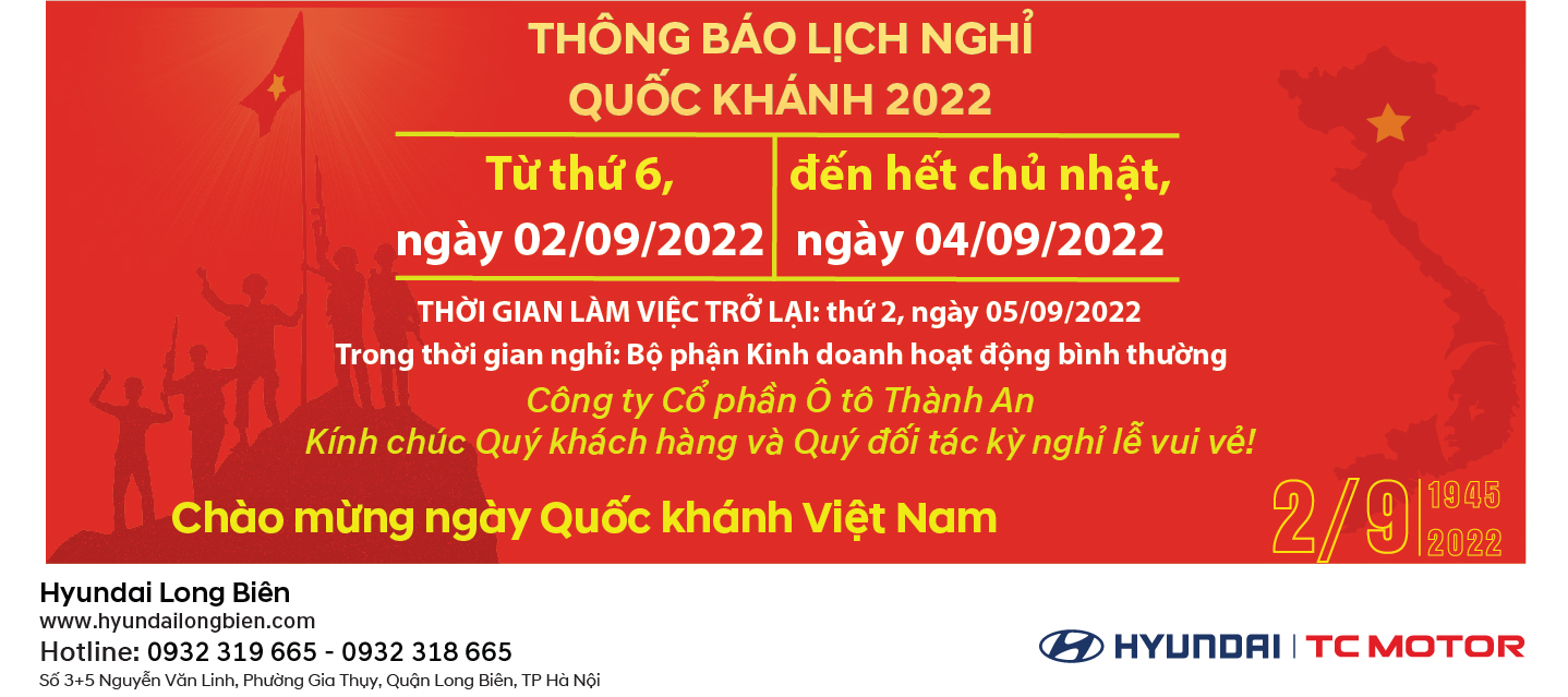Để thuận tiện cho việc giao dịch và sử dụng dịch vụ tại Hyundai Long Biên, chúng tôi xin gửi tới quý khách hàng thông báo nghỉ lễ Quốc Khánh 2/9/2022 như sau: