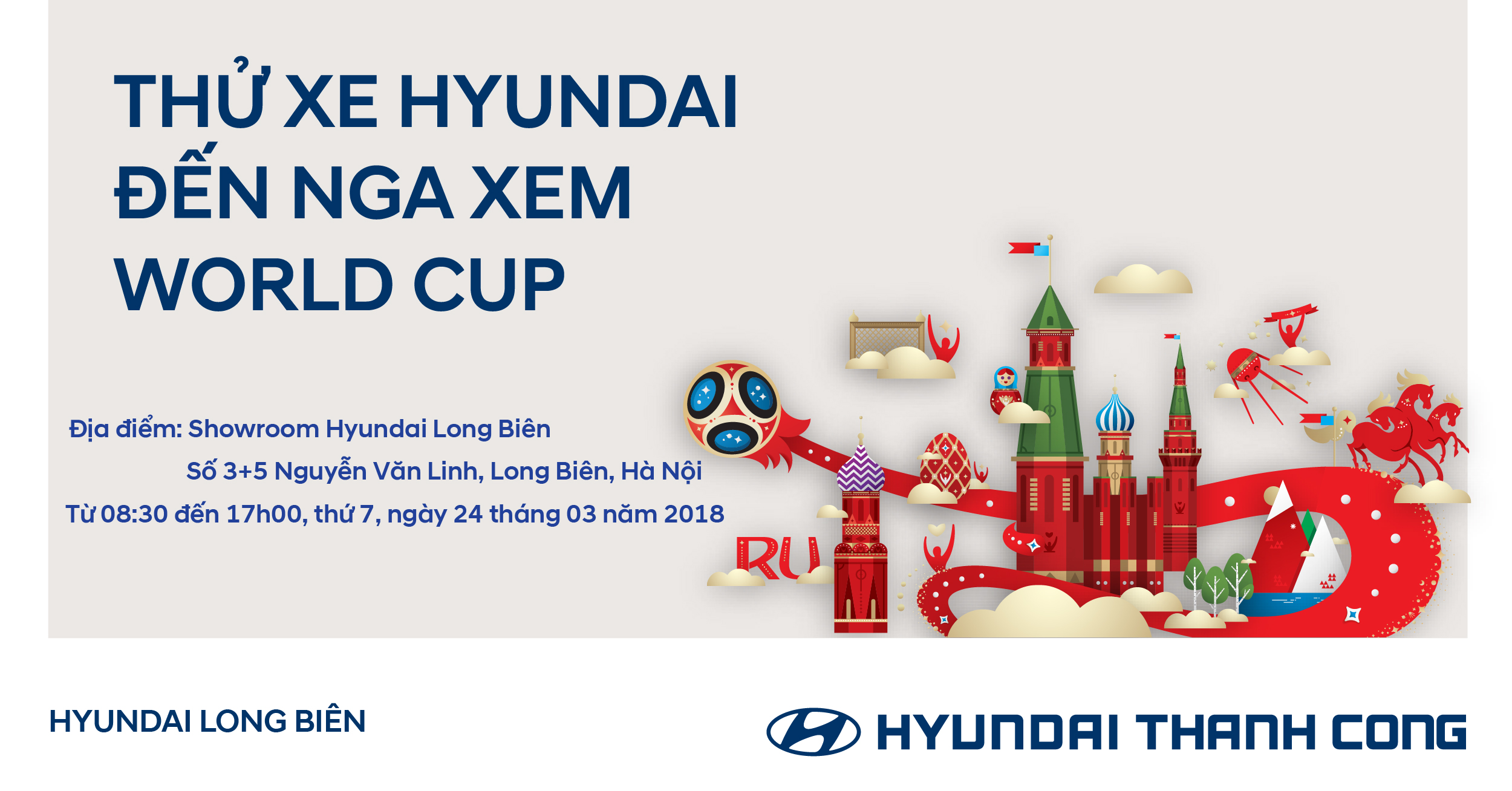 THỬ XE HYUNDAI – ĐẾN NGA XEM WORLD CUP” vào thứ 7, ngày 24/03/2018. Đến với chương trình, Quý khách hàng sẽ có cơ hội được cảm nhận trực tiếp thực tế lái các mẫu xe của Hyundai như Tucson 2017, i10 2017, SantaFe, Elantra,..., bên cạnh đó Quý khách hàng sẽ nhận nhiều những phần quà có giá trị, đặc biệt là có cơ hội nhận được giải thưởng là 2 chuyến du lịch đến Nga xem Worl Cup 2018.