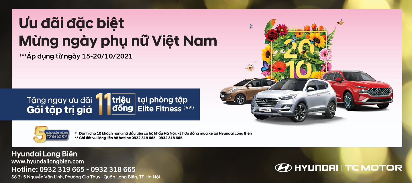 Nhân dịp ngày phụ nữ Việt Nam 20/10/2021, Hyundai Long Biên dành tặng chương trình ưu đãi dặc biệt cho khách hàng nữ khi mua xe tại đại lý. Chương trình áp dụng từ ngày 15/10-20/10/2021.